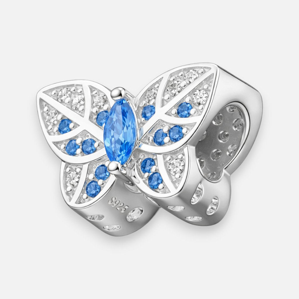 Delicado charm con diseño de mariposa, adornado con circones color agua marina que aportan un brillo sutil y elegante. Su figura simboliza transformación, libertad y belleza, convirtiéndolo en un accesorio ideal para personalizar pulseras o collares, añadiendo un toque luminoso y femenino a cualquier estilo.