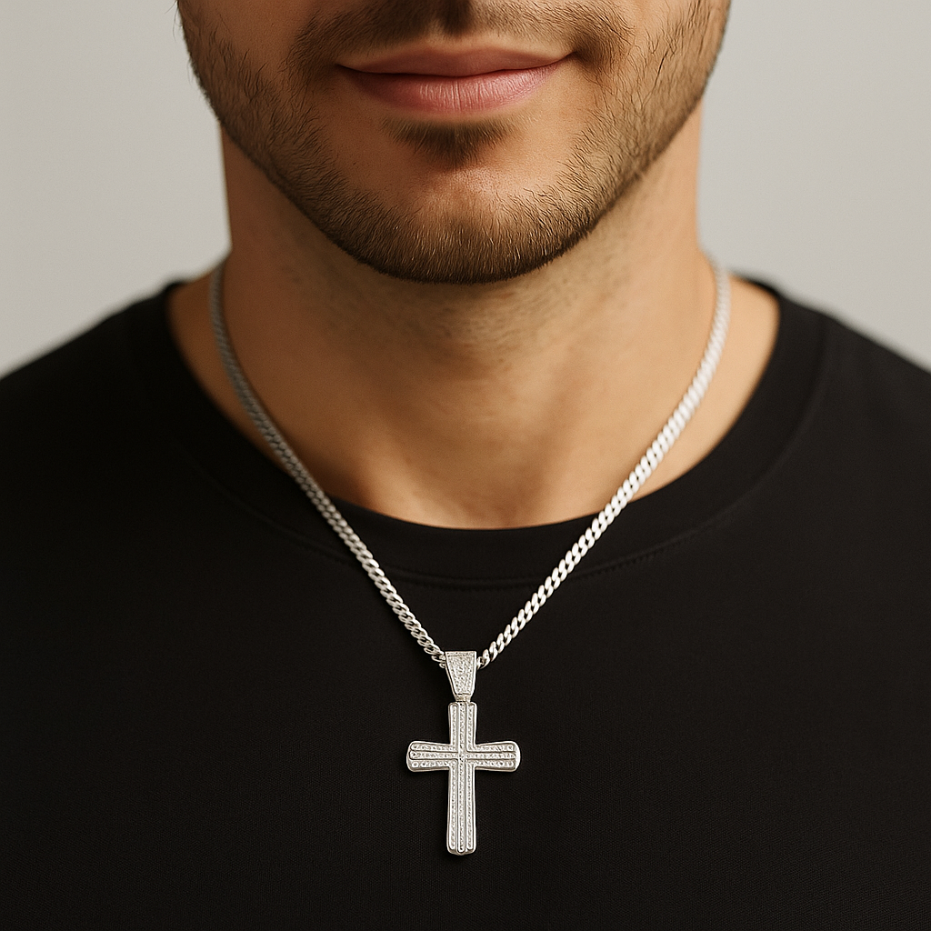 Colgante Cruz con Circones en plata 925, diseñado con brillantes circones que aportan luz y elegancia a una pieza de gran significado. Un accesorio sofisticado y atemporal, ideal para expresar fe con un toque moderno y refinado.