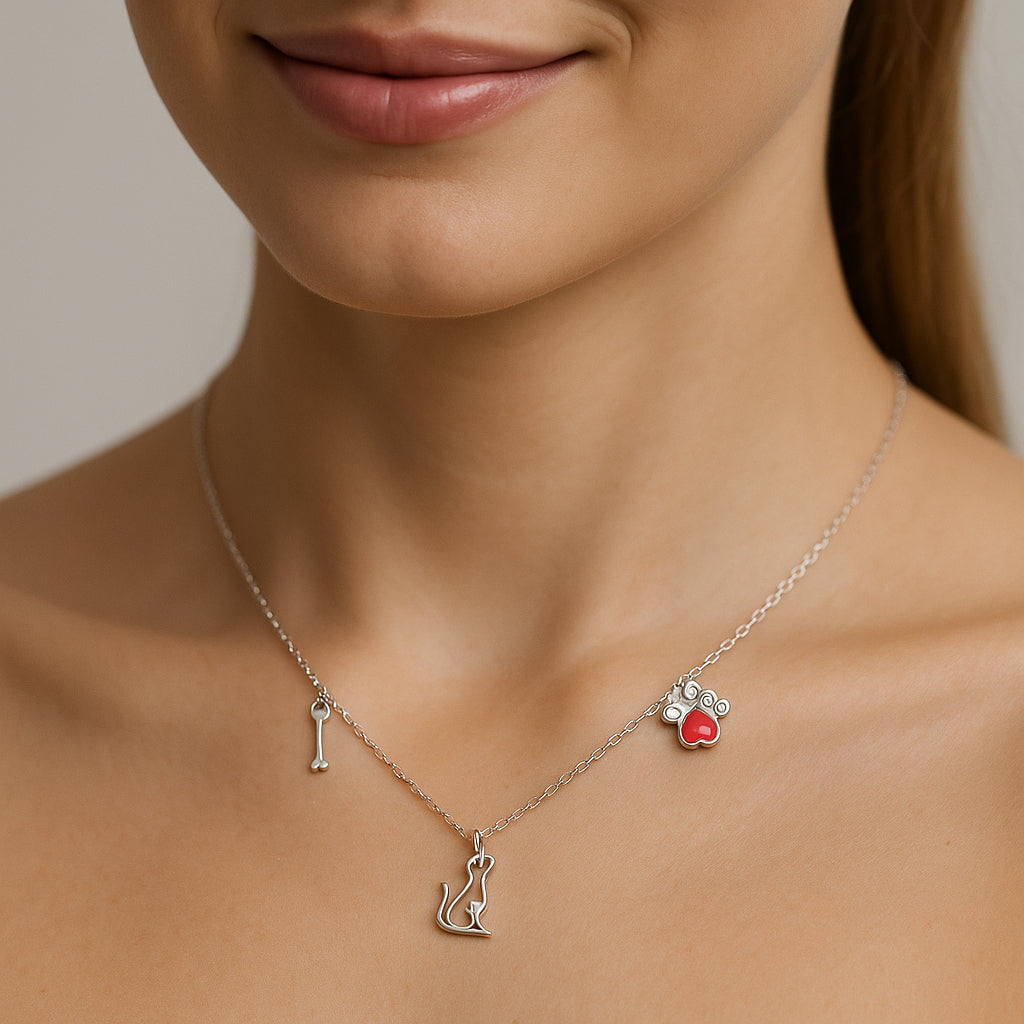 Collar en plata 925, un diseño encantador que combina delicados detalles y el brillo intenso del circón tono rubí. Una pieza tierna y significativa, perfecta para quienes aman a sus mascotas y desean llevar un símbolo de amor y lealtad siempre cerca.