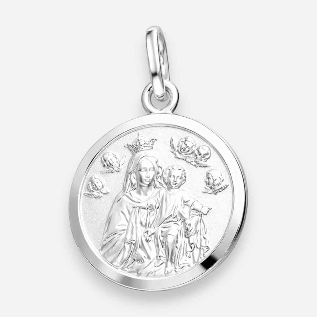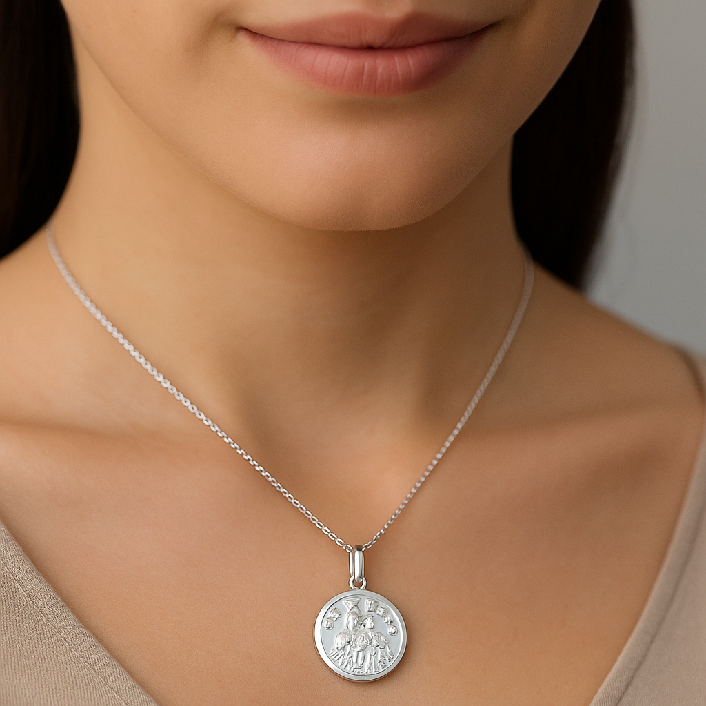 Colgante Virgen del Carmen elaborado en fina plata 925, con delicados detalles que realzan su simbolismo y elegancia. Una joya de profunda tradición y significado espiritual, ideal para llevar protección y devoción en todo momento.