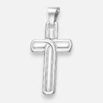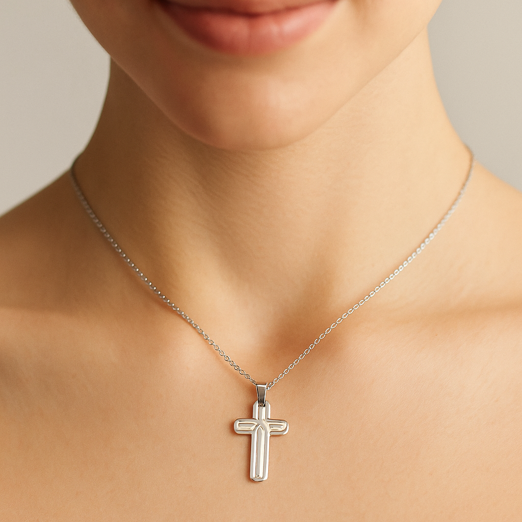 Colgante Cruz en plata 925, de diseño minimalista y acabado pulido que resalta su brillo natural. Una pieza sobria y elegante, perfecta para quienes buscan un símbolo de fe con estilo moderno y versátil.